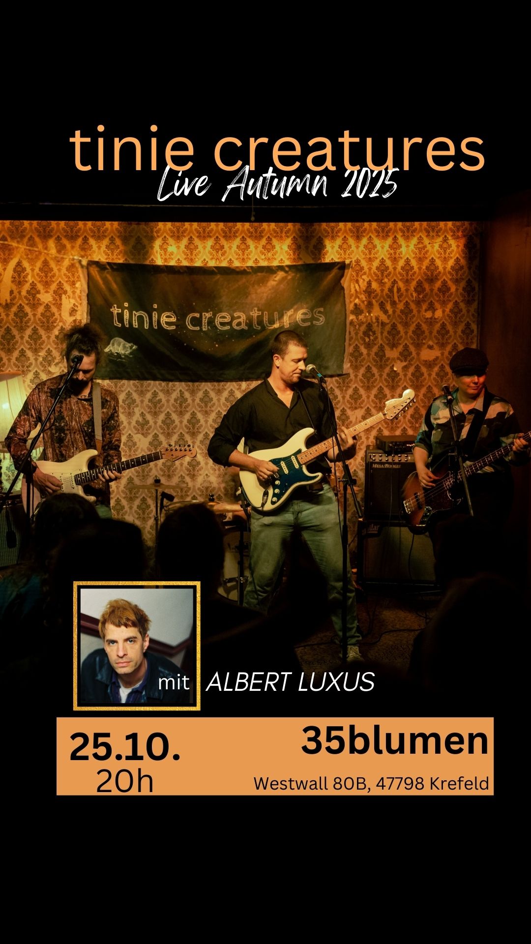 TINIE CREATURES aus Köln bieten eine Mixtur aus Dream-Pop, New Art-Rock und gefühligem Singer-Songwriter-Gestus. Besonders markant ist Tom Brandts variable Stimme, mit der er ebenso spielt wie mit seiner Gitarre und die das Publikum schon bei den letzten Auftritten im 35blumen begeisterte. Das erinnert in vielen Momenten an Jeff Buckley, ohne ihn zu imitieren. Euch und uns erwarten viele wunderschöne (und auch melancholische) Musikmomente. Als Support ist Albert Luxus aus Köln mit dabei.