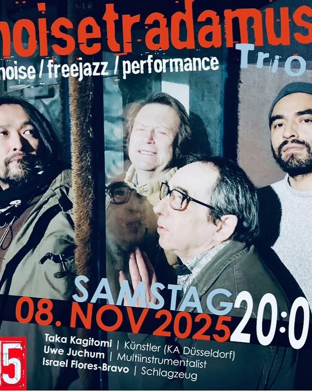 Noise, Free Jazz und Performance von Taka Kagitomi (Kunstakademie Düsseldorf), Uwe Juchum (Multiinstrumentalist) und Flores-Bravo (Israel), Drums. (Und wer ist bloß der vierte Mann auf dem Foto?)